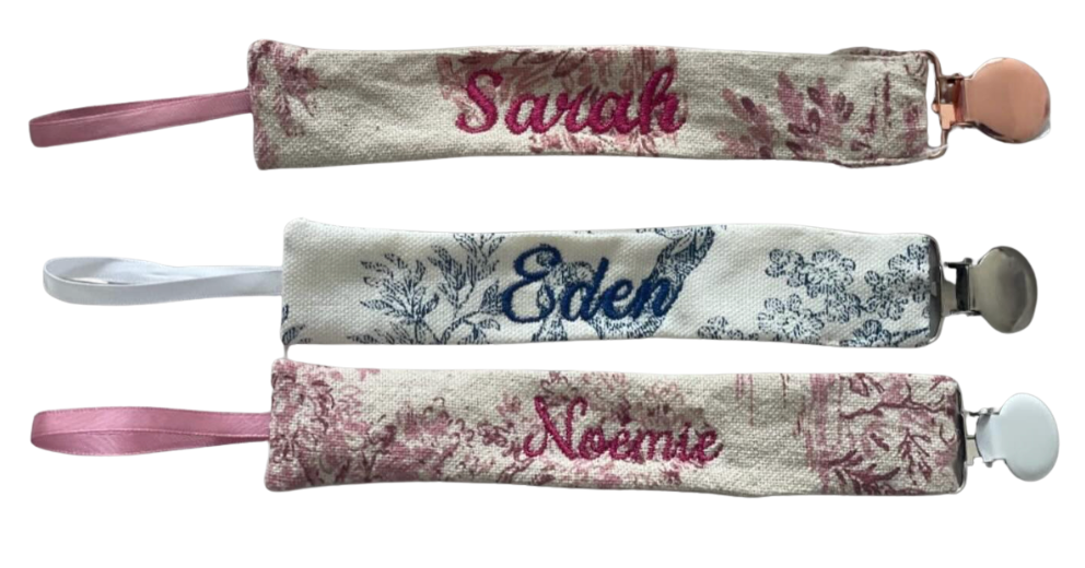 Attache-tétine en tissu, entièrement personnalisable : choix du tissu, broderie ou flocage du prénom.
