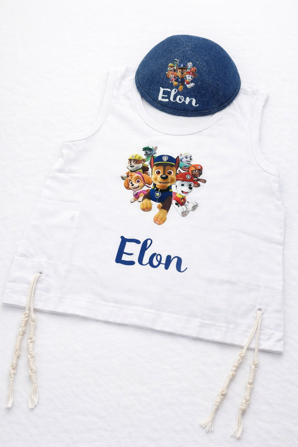 Tsitsit personnalisable en flocage avec le personnage de votre choix et le prénom de l’enfant.